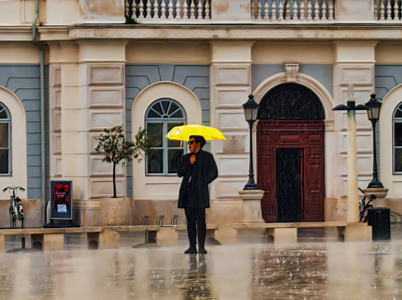 There are great elements in the image from the bike, sign, door and of course the person with the brolly. And it being Yellow, brings it out well.